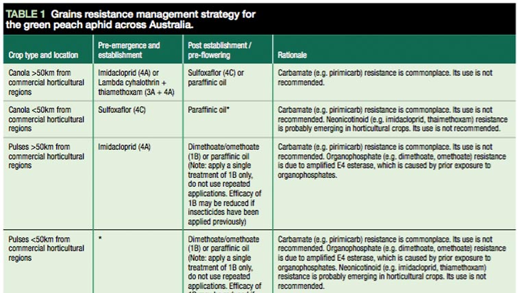 Five chemical subgroups are registered to control GPA in grain crops in Australia: carbamates (Group 1A); synthetic pyrethroids (Group 3A), organophosphates (Group 1B); neonicotinoids (Group 4A); and sulfoxaflor (Group 4C). High levels of resistance to carbamates and pyrethroids are now widespread across Australia. Moderate levels of resistance to organophosphates have been observed in many populations, and there is evidence that resistance to neonicotinoids is evolving.