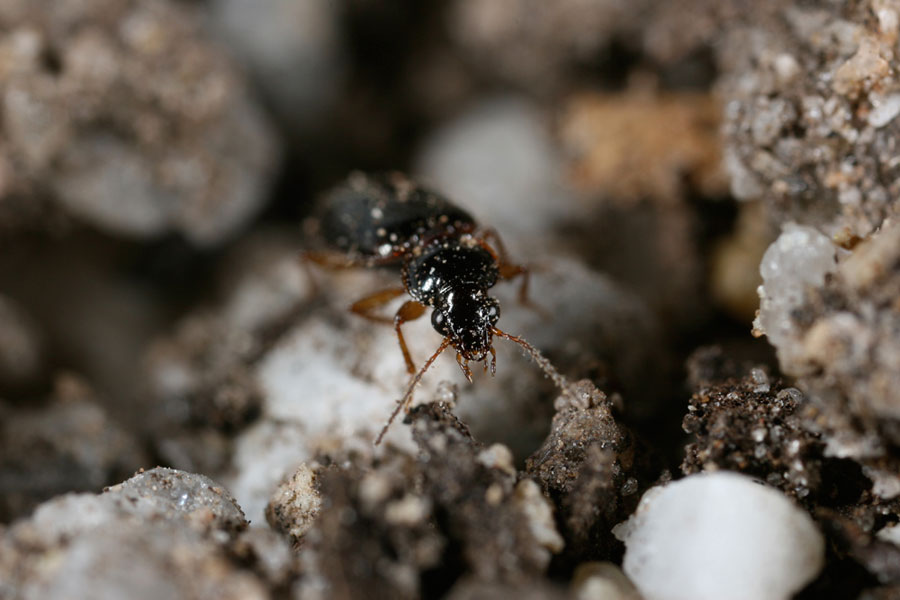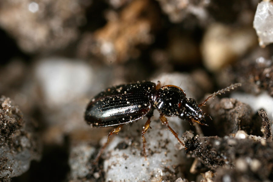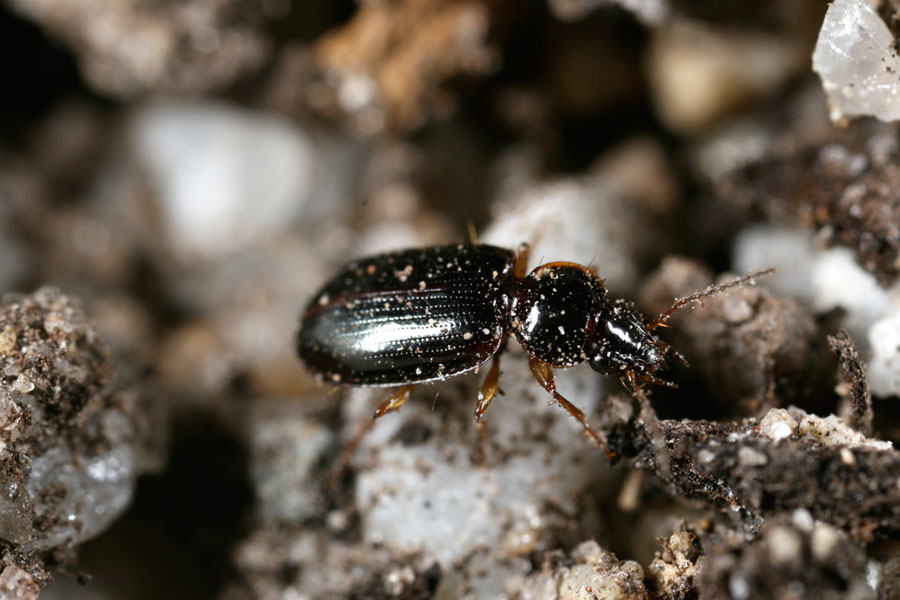 Small carabid beetles feed mostly on ground-dwelling pests. Larvae and adults are predatory and have prominent mouthparts that protrude forward. Adults are quite small, growing to only about 6mm in length. They are primarily active in winter-early spring. They have a characteristic flattened 'hot-water-bottle'- shaped body and large bulging eyes on the sides of the head. Small carabid beetles eat a wide range of soft-bodied invertebrates.