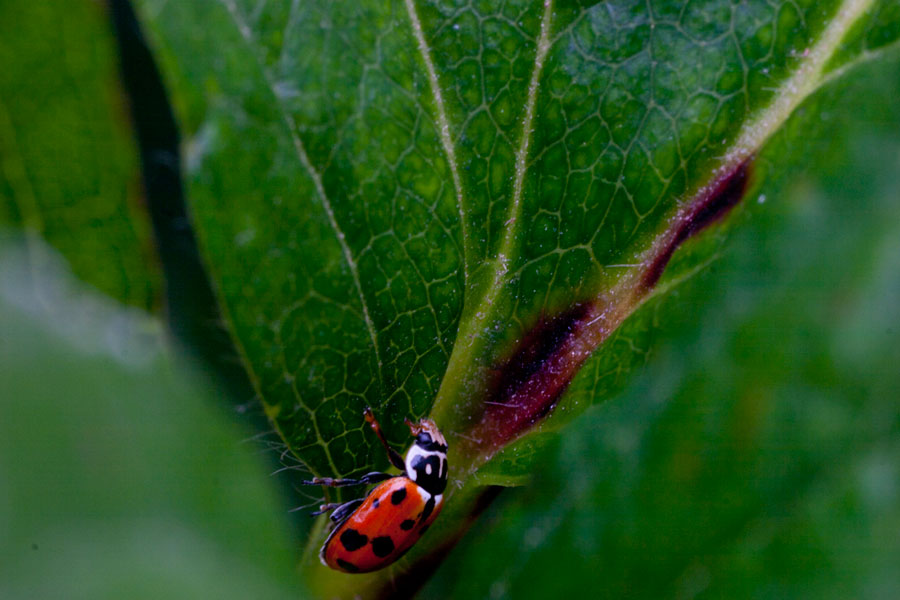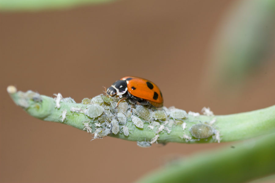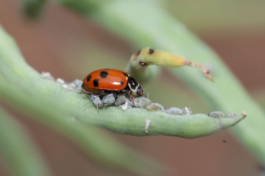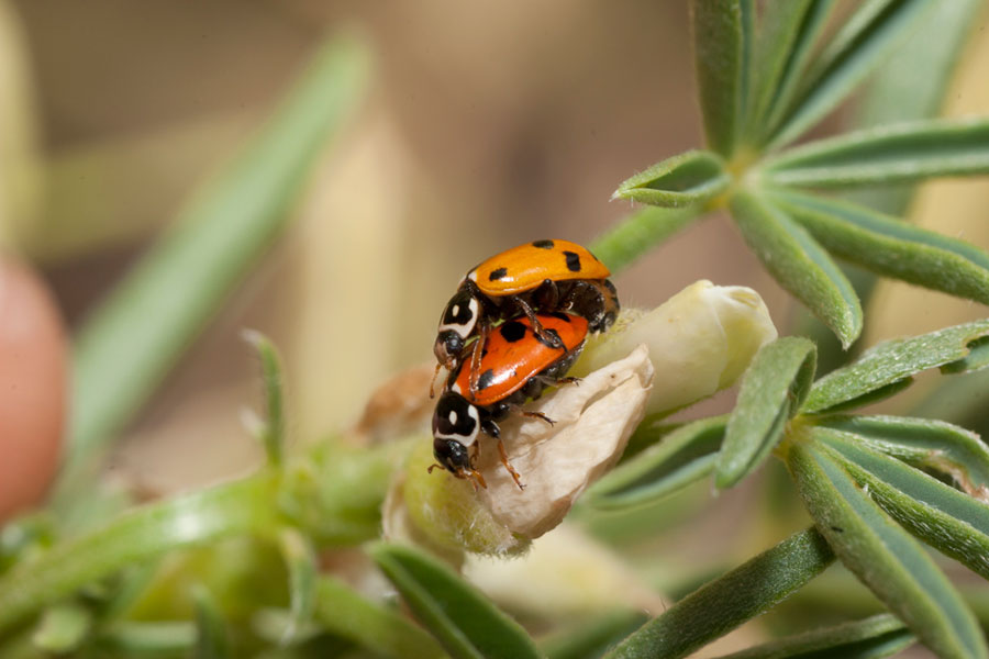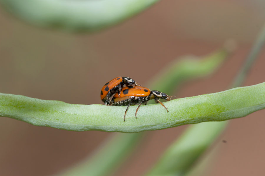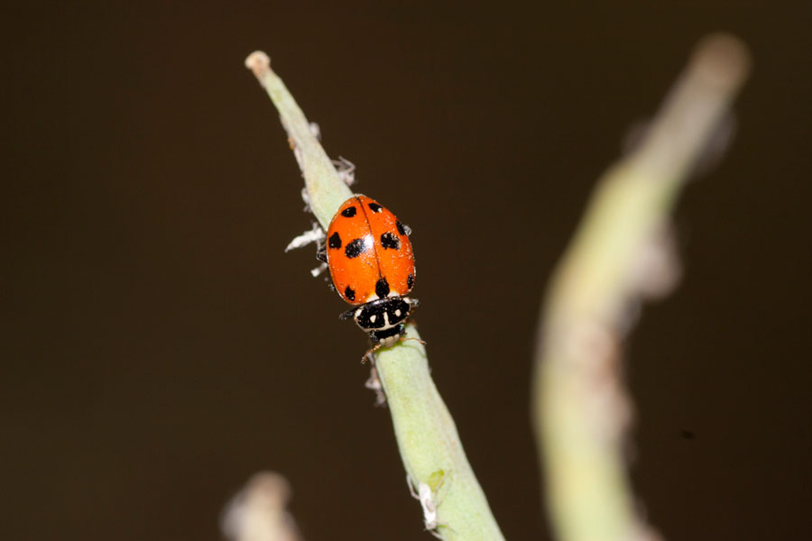 The white-collared ladybird was introduced into Australia. Adults have a black head with white patterns and a white patch stretching across the pronotum (the 'shield' between the head and the wingcases). They have at least two (usually more) black spots on the back. Ladybird adults and larvae are predatory and consume prey. They are important predators of aphids, leafhoppers, thrips, mites, moth eggs and small larvae. Ladybird eggs are generally yellow, spindle-shaped and laid standing on end in groups.
