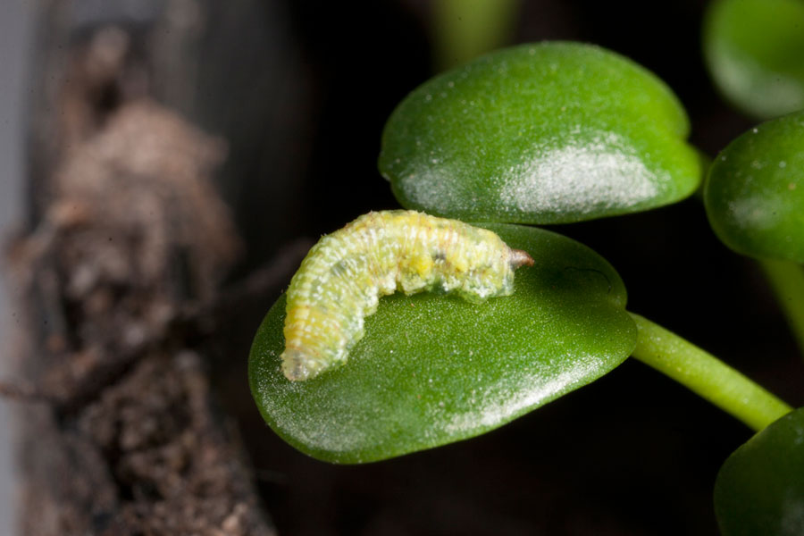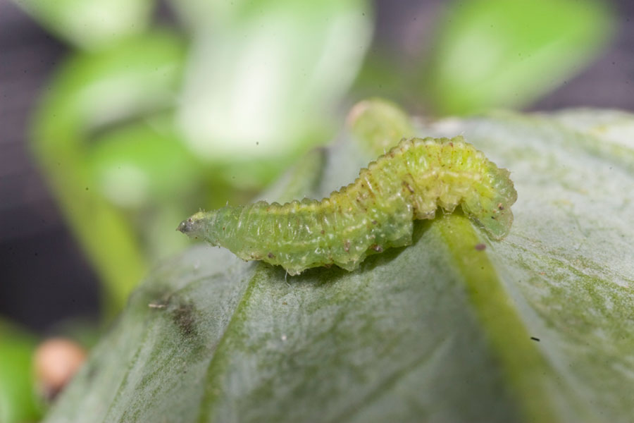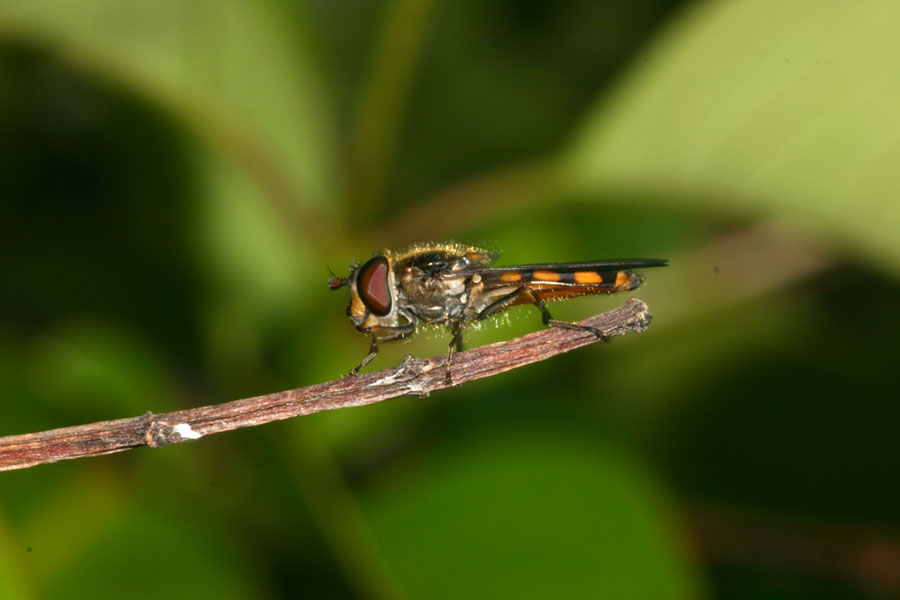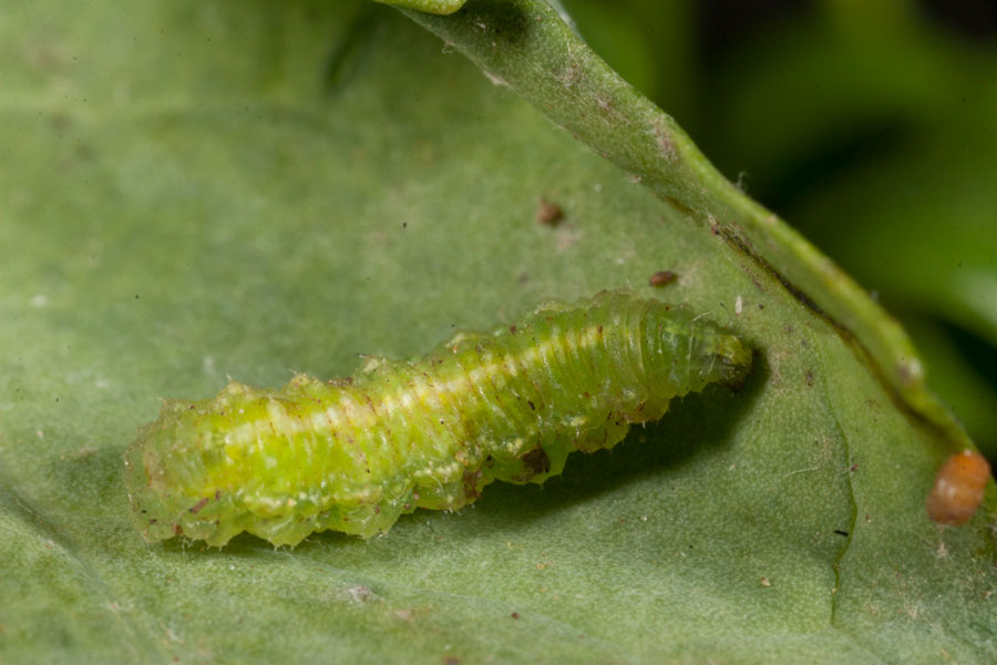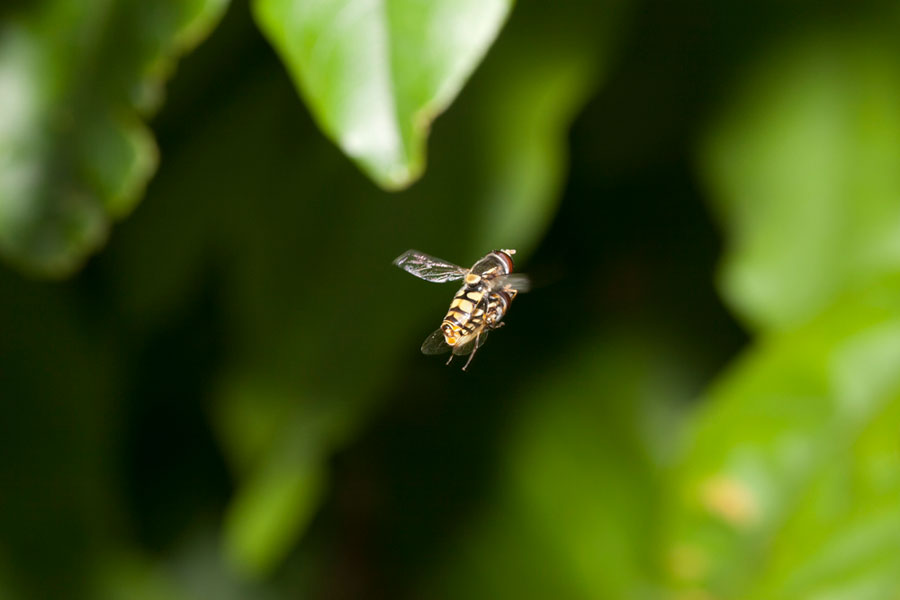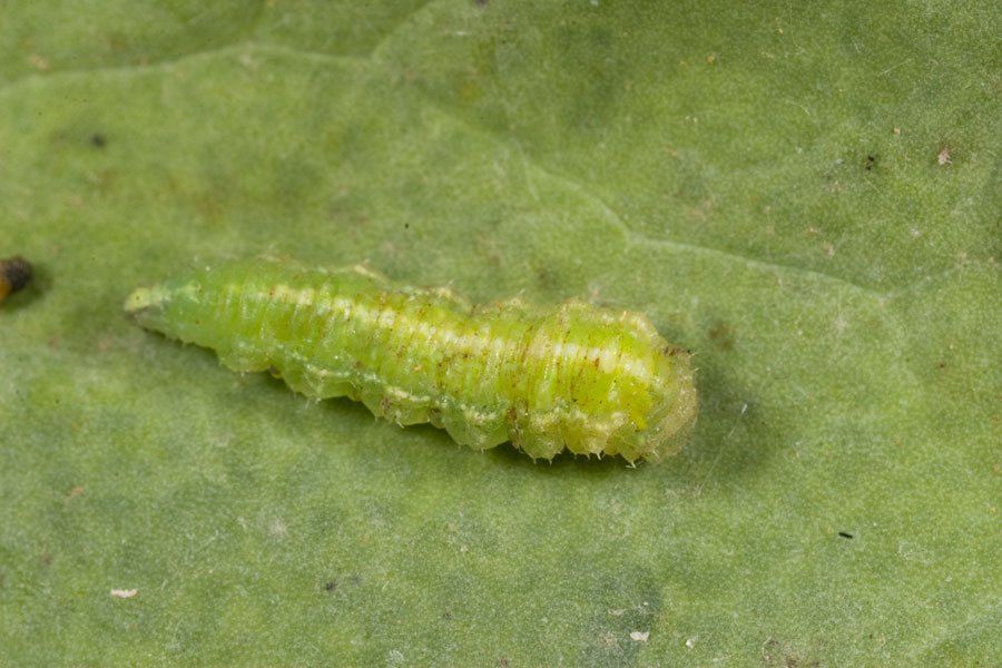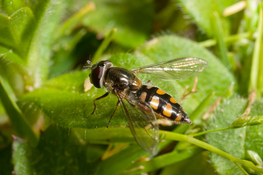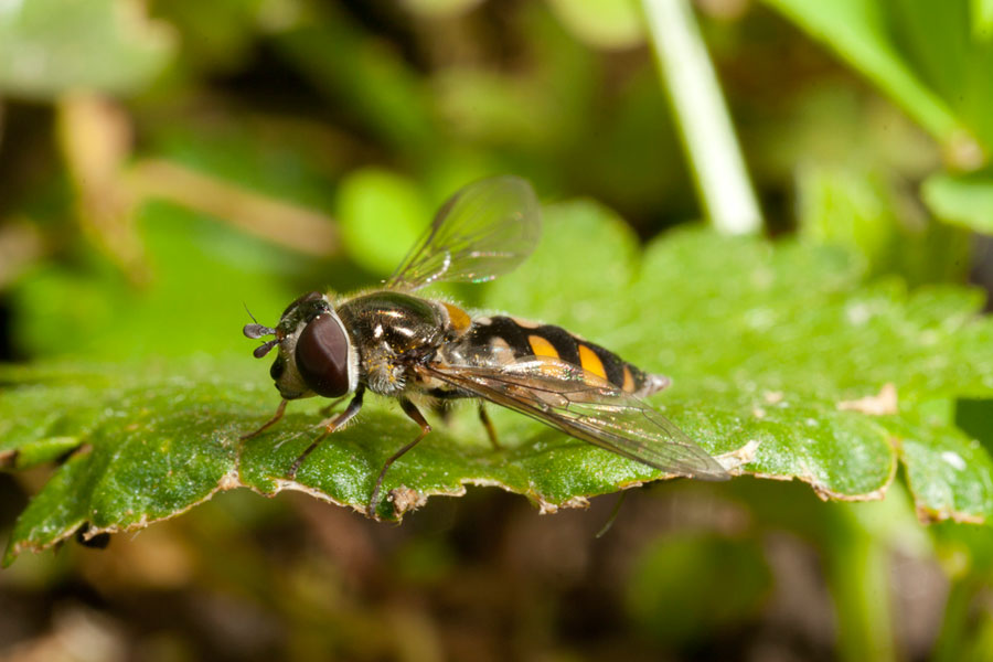 Adult hoverflies are 4-7 mm long and have a dark-coloured, flattened body with black and yellow markings. They can hover or fly swiftly, and like all flies, have only one set of wings. The adults feed on pollen and honeydew and do not feed on insects. The larvae are generally green in colour with a whitish stripe down the centre of their back. The larvae are grub or maggot-like (with no visible legs), and can be mistaken for pest grubs such as the diamond back moth. They grow up to 8-10 mm long and importantly, are predatory. They attack aphids, spearing them with their prominent mouth hook.