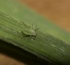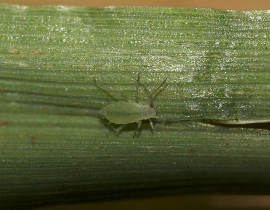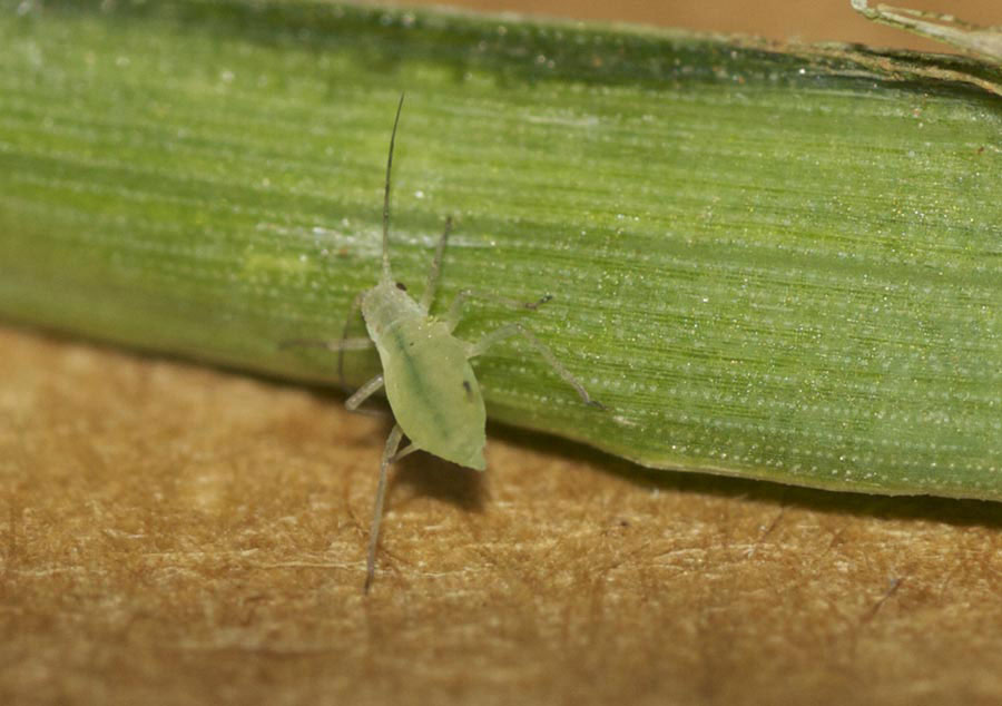 Adult rose-grain aphids are green to yellow-green in colour, with an obvious darker green stripe down the middle of their back. They grow up to 3 mm long and possess long antennae and long cornicles. The tips of the antennae are dark in colour. They attack cereals and grasses, and transmit barely yellow dwarf virus.