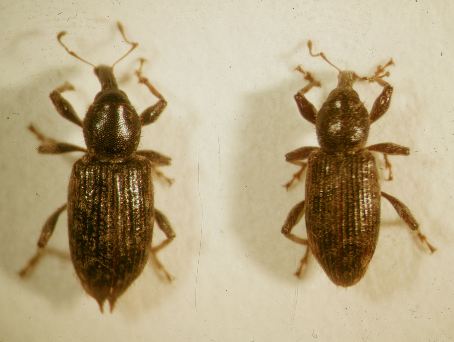 Adults are greyish-black in colour and have a typical weevil like snout. They grow up to 7 mm long and are flightless. The wing covers of the females are tapered at the ends to form two spines. Males lack these spines and are usually slightly smaller than females. Adults are unable to fly. Larvae are white, legless grubs with a yellow head capsule and grow up to 8 mm long. The larvae attack cereals, and look similar to spotted vegetable weevils.
