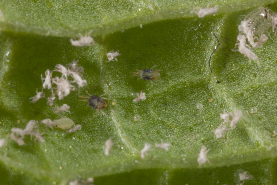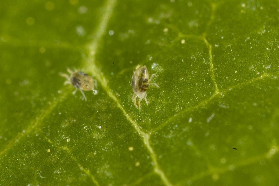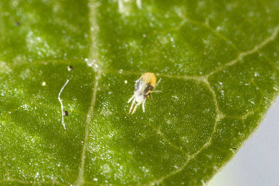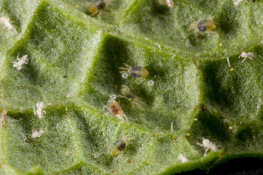 Spider mites have a very broad host range, including a range of agricultural and horticultural crops, as well as attacking some ornamental plants. Spider mites are very tiny; the adult females are only 0.3-0.5 mm long and the males are even smaller. They are often red, brown, green or yellow in color and they can be seen clearly with the aid of a hand lens. The immature stages resemble the adults except they have six legs. They feed on the undersides of leaves, causing leaves to display yellowing or bronzing appearance. The life cycle of a spider mite takes approximately 1-2 weeks to complete depending on environmental conditions and consists of five developmental stages: egg, larva, protonymph, deutonymph and adult.