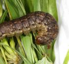 There are several species of cutworm which attack a variety of crops and pastures. Cutworm larvae are generally plump, greasy in appearance, and smooth bodied with most having uniform colouring ranging from pinkish brown to black. They grow up to 40-50 mm long and hide under the soil or litter by day. They can often be located by scratching the surface near damaged plants; when disturbed they curl-up and remain stiff as a defensive response. As the name implies, cutworms chew through plant parts, often felling the plant at ground level. They are most damaging in autumn when caterpillars transfer from summer and autumn weeds onto newly emerged seedlings. Moths vary in colour from dull brown to black with wingspans ranging from 30-50 mm.