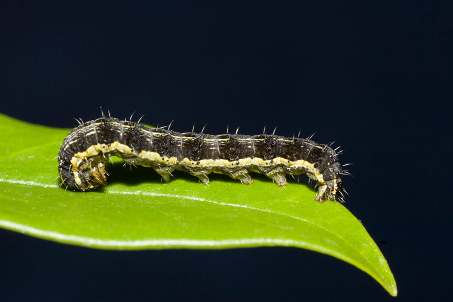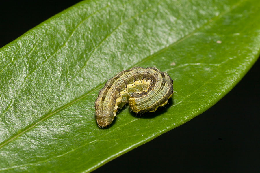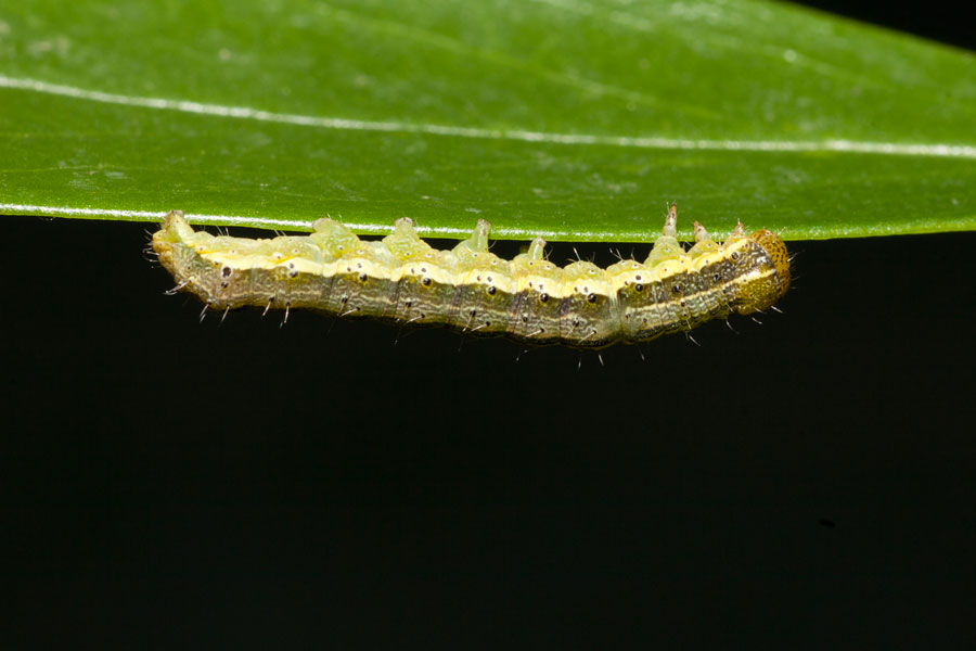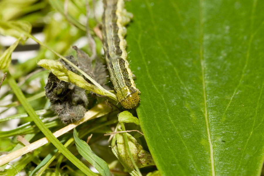 The lesser budworm is closely related - and looks similar to - the native budworm (Helicoverpa punctigera). Lesser budworm larvae are usually dark in colour, with a light coloured strip down each side of the body. For older larvae (>20 mm in length), lesser budworm has white hairs on the collar segment and the body, whereas native budworm has black hairs on the collar and black to blackish-brown body hairs. Lesser budworm moths are generally darker in colour than the native budworm, and adults have a distinctive pattern on the forewing. Lesser budworm usually occurs in outback Australia, and outbreaks in agricultural regions are a rare event. The potential level of damage this species can cause is unclear; however they have previously been recorded attacking pulses, medics, canola and cereals.