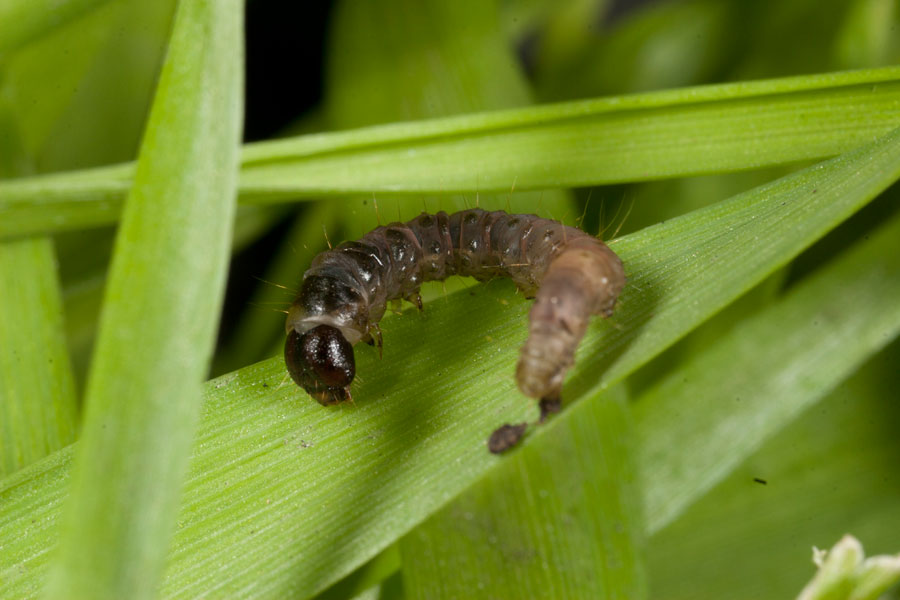 Pasture tunnel moth larvae have a slender (about 2-3mm wide), grey-brown coloured body which makes them very inconspicuous in the soil. Larvae live in silk-lined tunnels which have a characteristic ‘chimney’ protruding above the soil surface. They grow up to 35 mm long and have several long sparse setae around the head. They are normally found in higher rainfall districts and can cause significant damage to annual and perennial grasses, and clovers. They have also been recorded damaging wheat and barley crops in the past. Adult moths are elongate, glistening white-cream in colour, around 20 mm long and have a wingspan of approximately 25 mm.