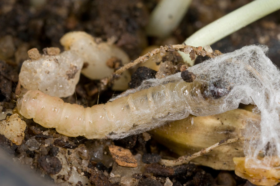Pasture webworm larvae are typically light-dark brown in colour and grow to approximately 20 mm long. They have a smooth body and shiny dark brown heads. Pasture webworm feed at night and hide inside web-lined tunnels beneath the ground by day. They typically feed on the soil surface or pull plant material into their tunnels, and can cause large losses to establishing cereal crops. Adult moths are long-legged with enlarged mouthparts arranged in a beak-like projection. They are 10-12 mm long with a wingspan of about 22 mm. Moths are easily detected as they fly up from pastures in the autumn.