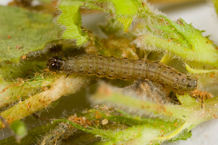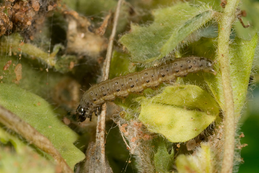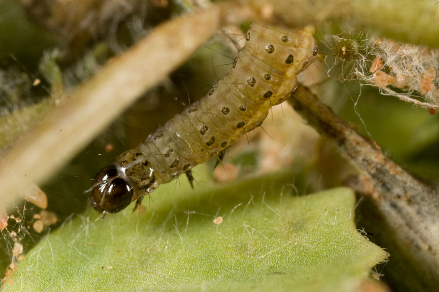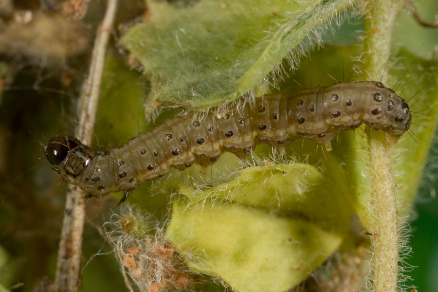 Larvae reach 15 mm in length and are slender, hairy, and can vary in colour between grey-green, dark-green or pale-brown. They have a black head and older larvae have a dark stripe down the middle of their back with three rows of small dark spots. Adult moths are 12 mm long with a 20 mm wingspan. They are pale yellow or cream in colour with darker brown markings on the forewings and black eyes. They feed on canola, soybeans, lupins, lucerne, cotton, medic pastures and a wide range of broad-leaved weeds.