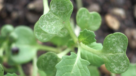 Trails of whitish grey spots to canola cotyledons caused by Bryobia mite feeding (Source: cesar)