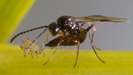 Aphid parasitoid (Aphidius sp.) laying an egg into an aphid nymph (Source: cesar)