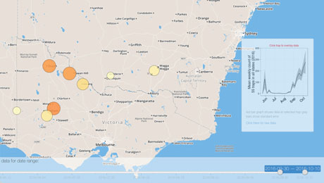 The latest catches (10 October) of native budworm moths in Victoria and southern NSW. Weekly moth counts are recorded in this interactive MothTrapVis tool and can be accessed by clicking the map image.