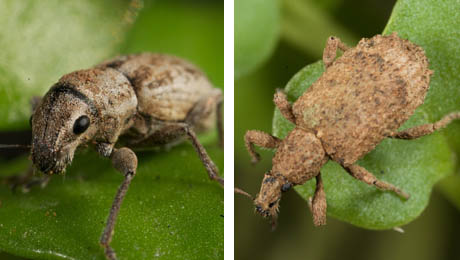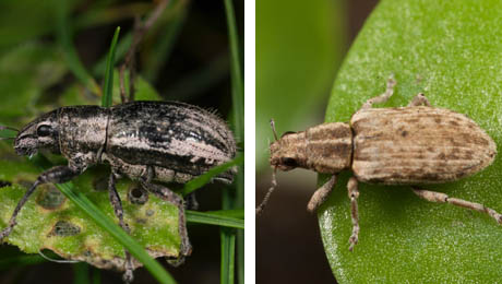 The small lucerne weevil (Atrichonotus taeniatulus) (left) has a short, broad snout compared with the elongated snout of the grey-banded leaf weevil (right) (Source: cesar)