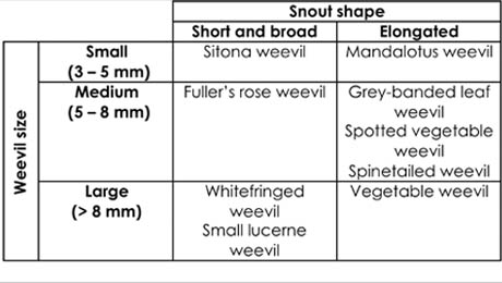 Successful management of pests starts with the correct identification. Generally it is easier to distinguish between adult weevil species than larval forms. The first feature to pay attention to is the shape of the weevil’s snout. Generally adult weevils can be divided into those that have an elongated, definite snout or a short, broad snout.