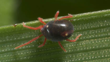 The three species of blue oat mite are best distinguished from RLEM by presence of a red spot on the upper abdomen (Source: cesar).