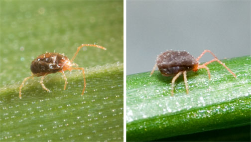 Brown wheat mites (left) have a globular body compared with Bryobia mites (right) which have a squashed appearance (Source: cesar).
