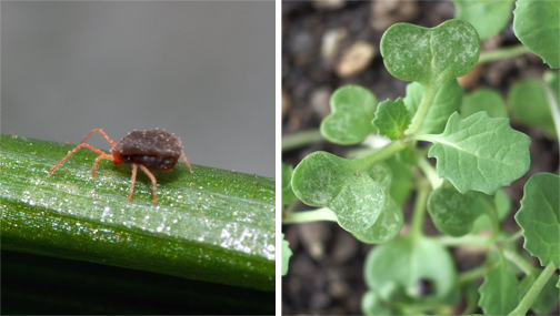 Bryobia mites (left) cause characertistic trails of white spots from feeding (right). Images: cesar