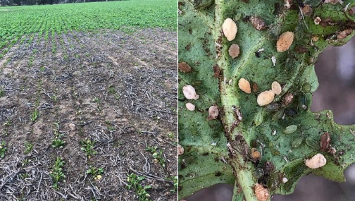 Green peach aphid, Myzus persicae, was discovered causing significant direct feeding damage in a canola crop near Marnoo, North Central Victoria. Very high numbers were discovered under the leaves with low lying, frost affected area most impacted.