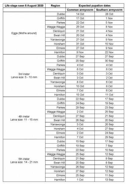 Using this model, we have constructed a table of estimated dates of when you could expect current populations to stop eating crops and pupate in key cereal growing regions of southern NSW and Victoria (see below).We don't expect that you will distinguish between the two species in the field; we have provided development times to provide a date range.